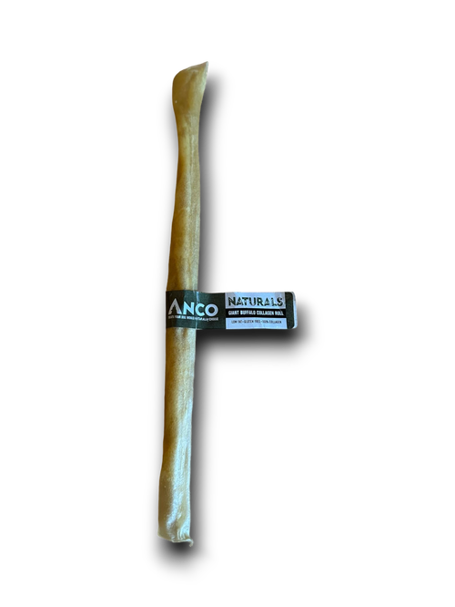 This 100% pure Collagen Roll has an irresistible flavour and satisfying texture. Collagen has many benefits for dogs, making Anco Giant Buffalo Collagen Rolls a great healthy option for your dog. Collagen helps to promote healthy Bones, Muscles, Tendons, Ligaments, Skin, fur and nail growth! As well as, Collagen also aids joint pain and digestive health. Chewing down on these healthy treats also helps keep their teeth nice and clean and keeps them entertained. Due to the size of these giant treats, they are an excellent choice if your dog is an enthusiastic chewer.